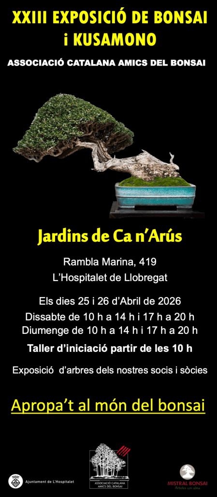 Serà el cap de setmana del 25 i 26 d’abril, als Jardins de Ca n’Arús, a l’Hospitalet de Llobregat. Podreu visitar els bonsais i kusamonos dels nostres socis i descobrireu altres sorpreses. Animeu-vos a venir!